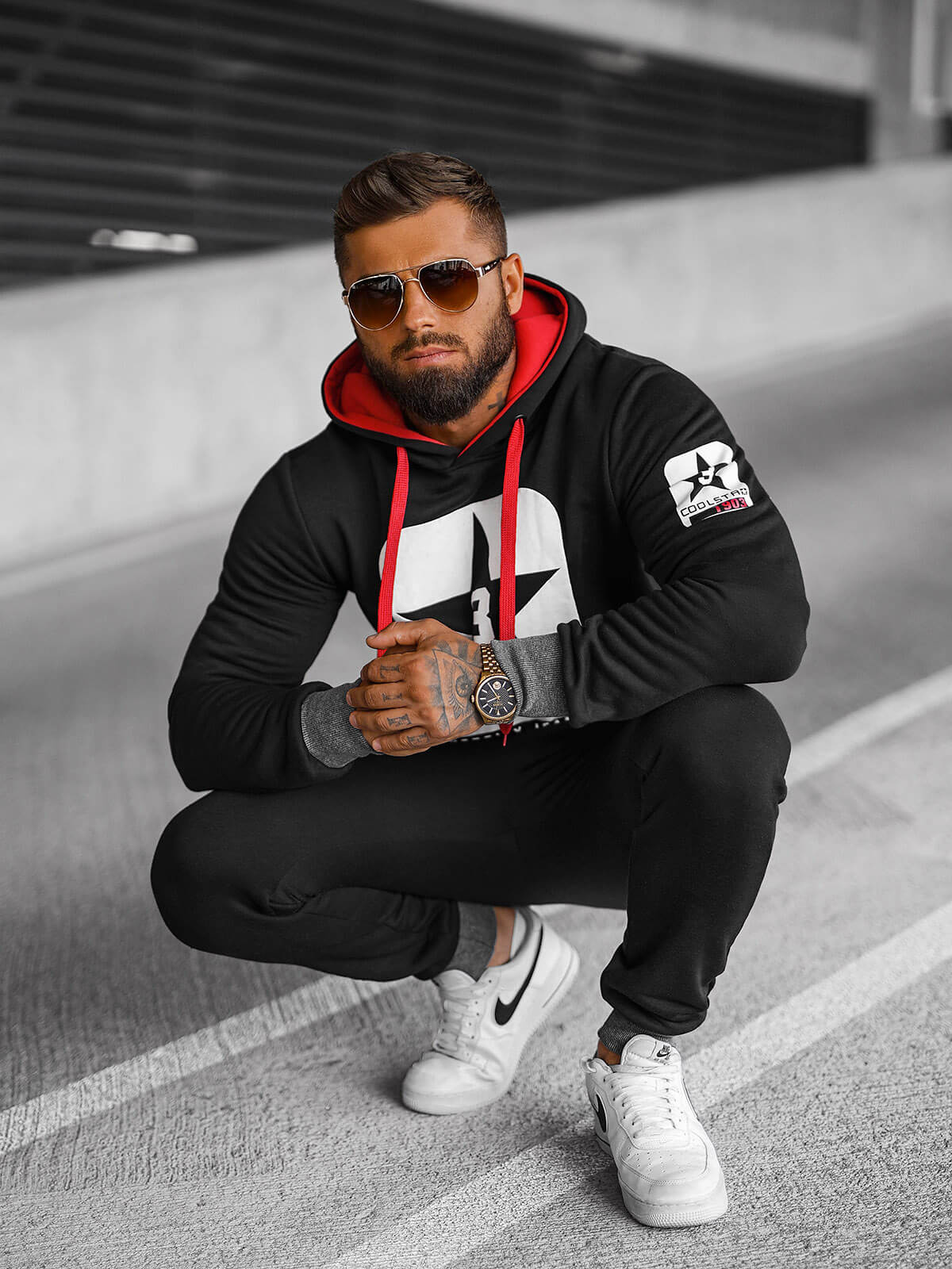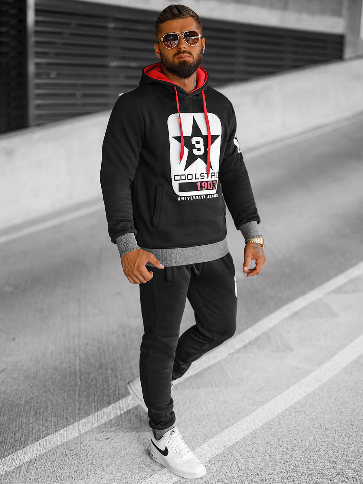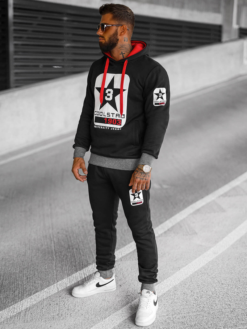Mikina s kapuco in hlače s stranskimi žepi niso le praktični, temveč celotnemu videzu dodajo tudi značaj. Zaključena z manšetami tako mikina kot hlače se odlično prilegajo, kar poudarja moški slog.