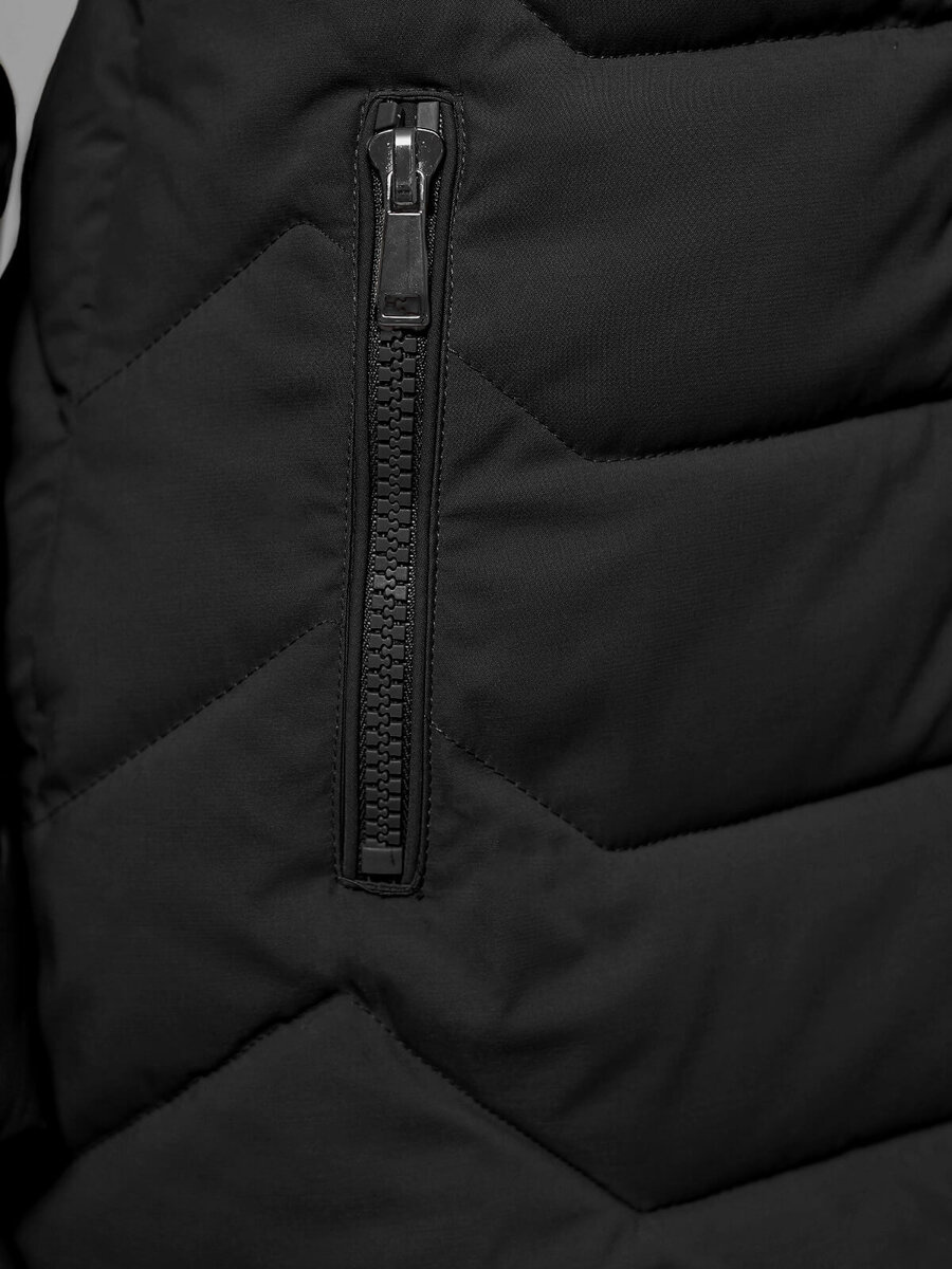 Ima snemljivo kapuco s krznom, zapiranje na zadrgo, modno prešitje, stranski žepi na zadrgo, rokavi z rebrastimi manšetami