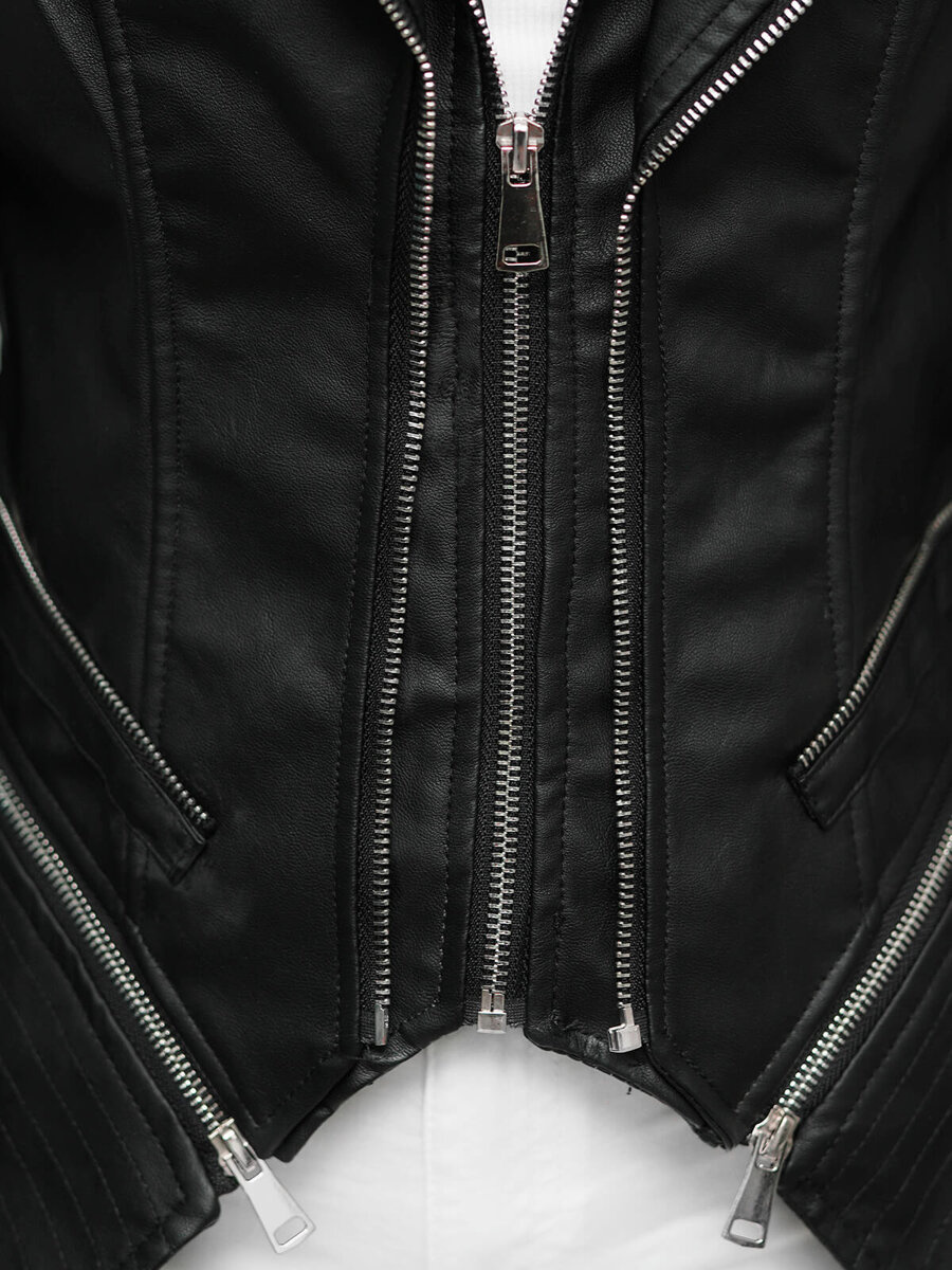 Če iščete izvirno kombinacijo klasičnega in modernega, je ženska usnjena jakna OZONEE črna JS/11Z8116 popolna izbira. Izdelana je iz materialu imitacije usnja, izstopa pa zaradi okrasnih klopi in zadrg. Stranska žepa z zadrgo povečujeta njeno funkcionalnost, obenem pa predstavljata zanimiv dekorativni element. Gre za model, ki združuje udobje pri nošenju in visokokakovostno izdelavo, zato vam bo zagotovo služil več sezon.